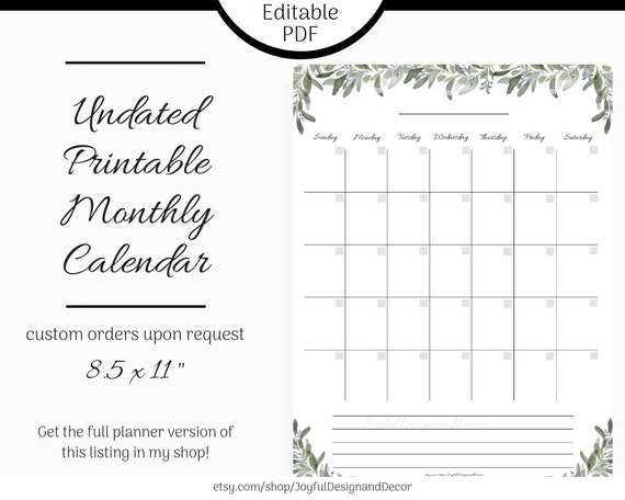 Blank Greenery Monthly Calendar Editable Calendar Undated Etsy