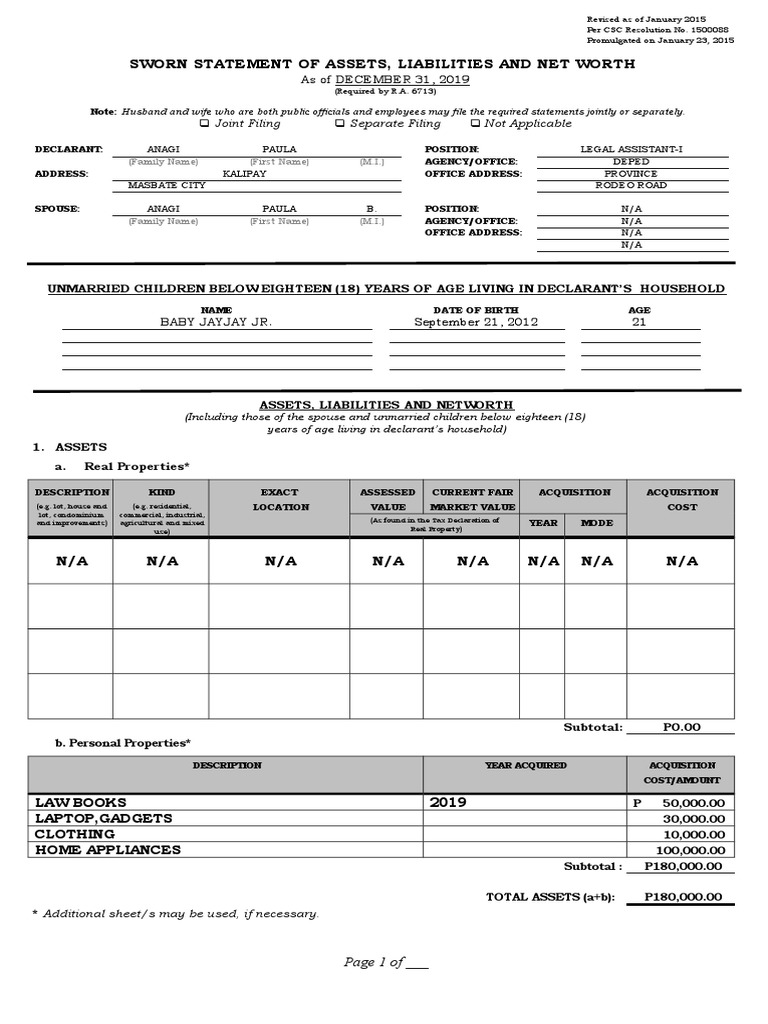 Revised Statement Of Assets Liabilities And Net Worth Saln Form