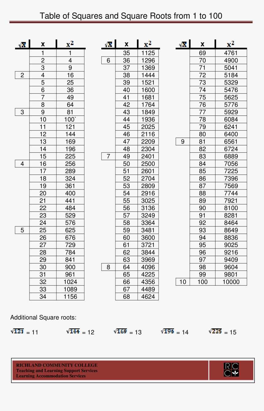 Square Root Number Chart Main Image Square 1 To 35 Hd Png